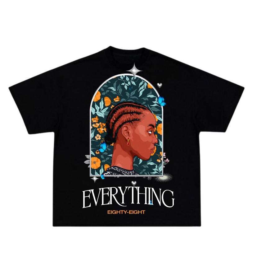 The Motherland Tee is more than fabric — it’s heritage reimagined. At its core is the portrait of an African child adorned in traditional braids, a symbol of innocence, pride, and cultural strength. From the crown of the braids, flowers bloom — a powerful metaphor for growth, creativity, and the unbreakable connection between roots and future.
