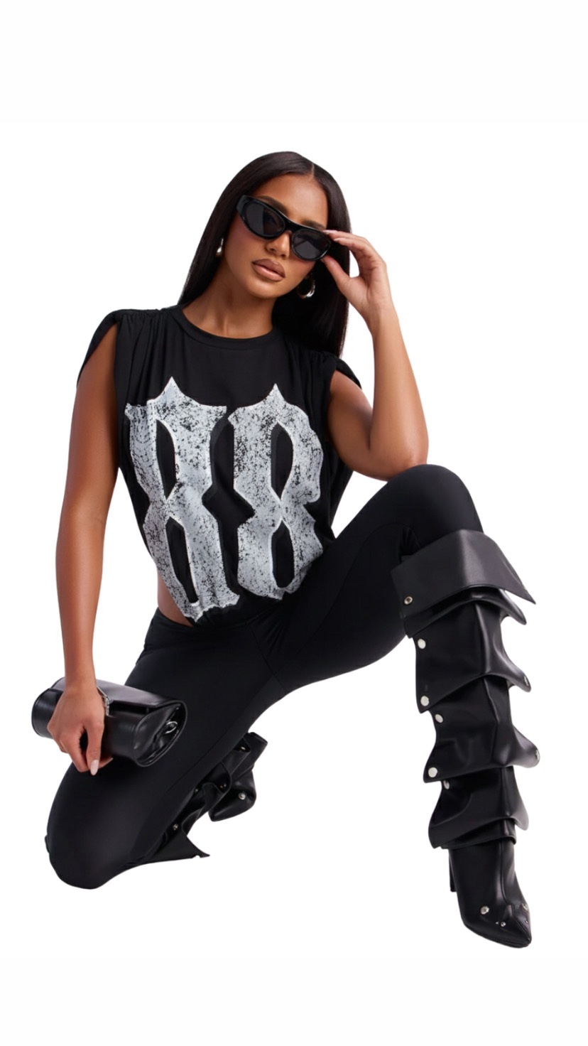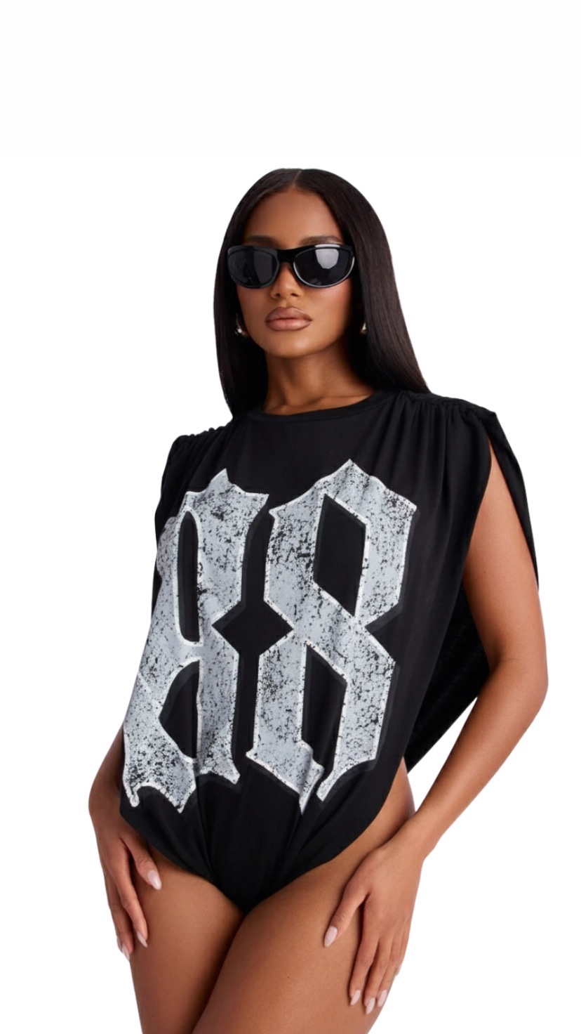 The Double Eight Bodysuit is a statement essential from Everything88. Designed with a sleek sleeveless silhouette and a high-cut finish, it blends minimal structure with bold identity.